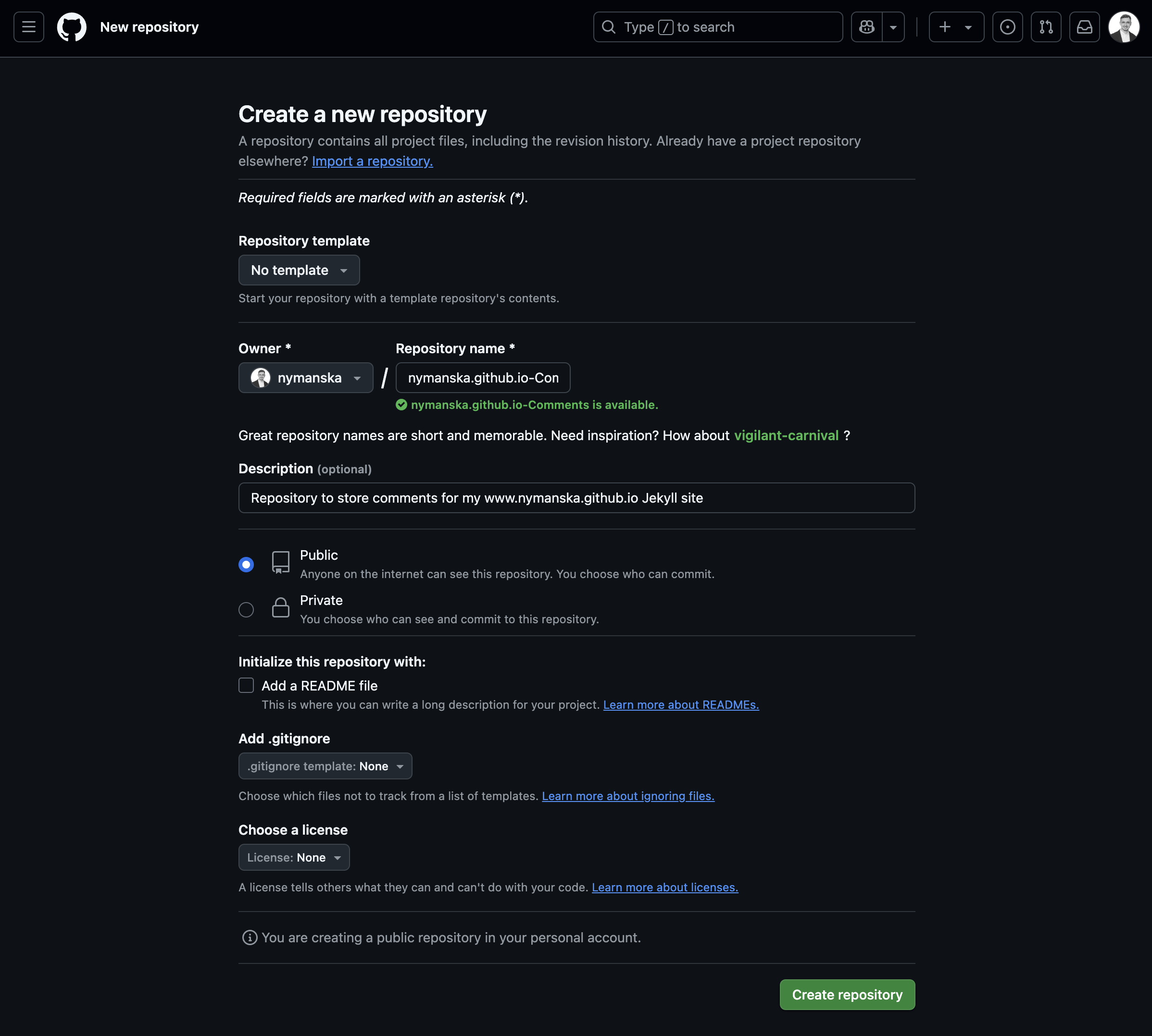 - Add the new repository name used to store the comments (for me this was: nymanska/nymanska.github.io-Comments)